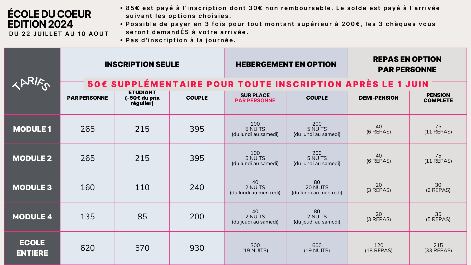 50€ supplémentaire pour toute inscription après le 1 juin.